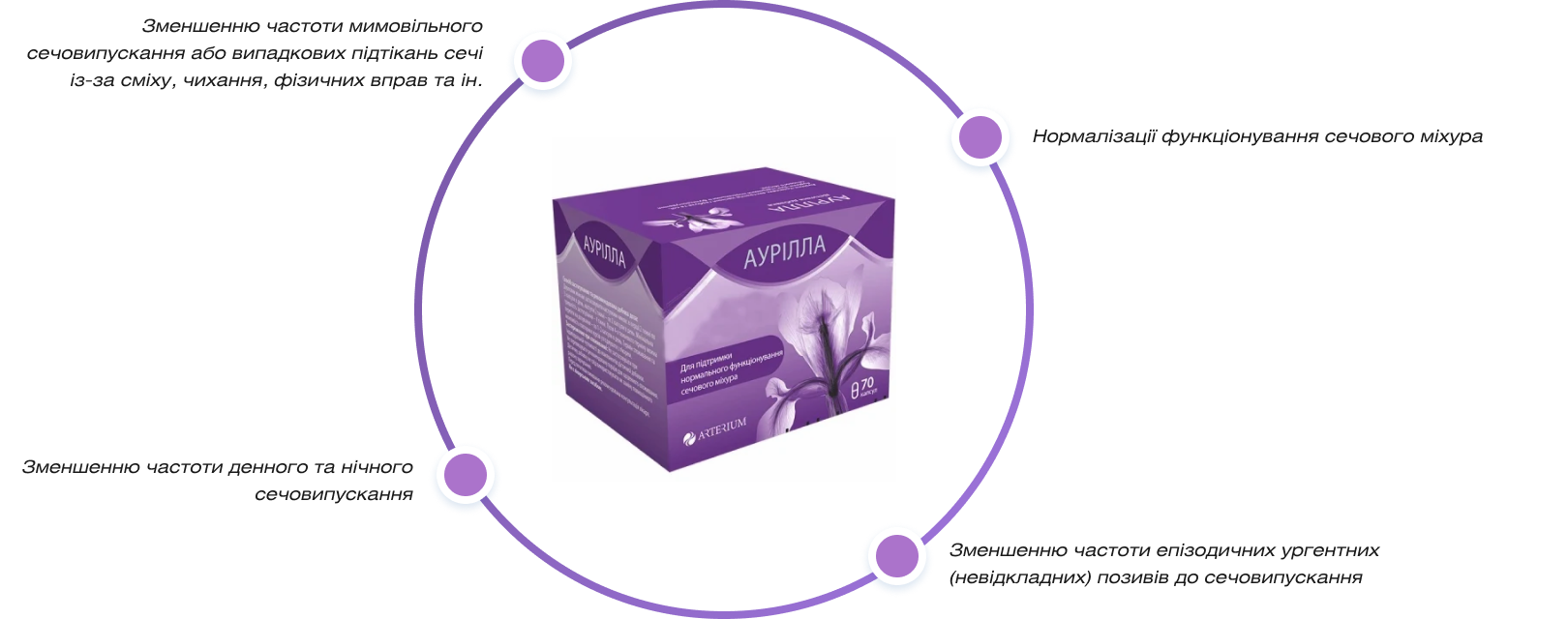 Аурілла сприяє зменшенню вираженості симптомів гіперактивного сечового міхура шляхом структурного покращення функцій сечового міхура та функції сфінктеру сечового міхура.